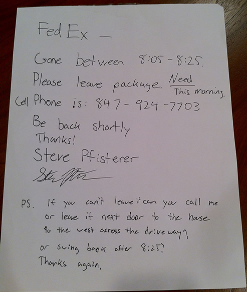 could get to work that morning. So I wrote a plea of passion to the FedEx man in a note and posted it on our door begging the him to leave